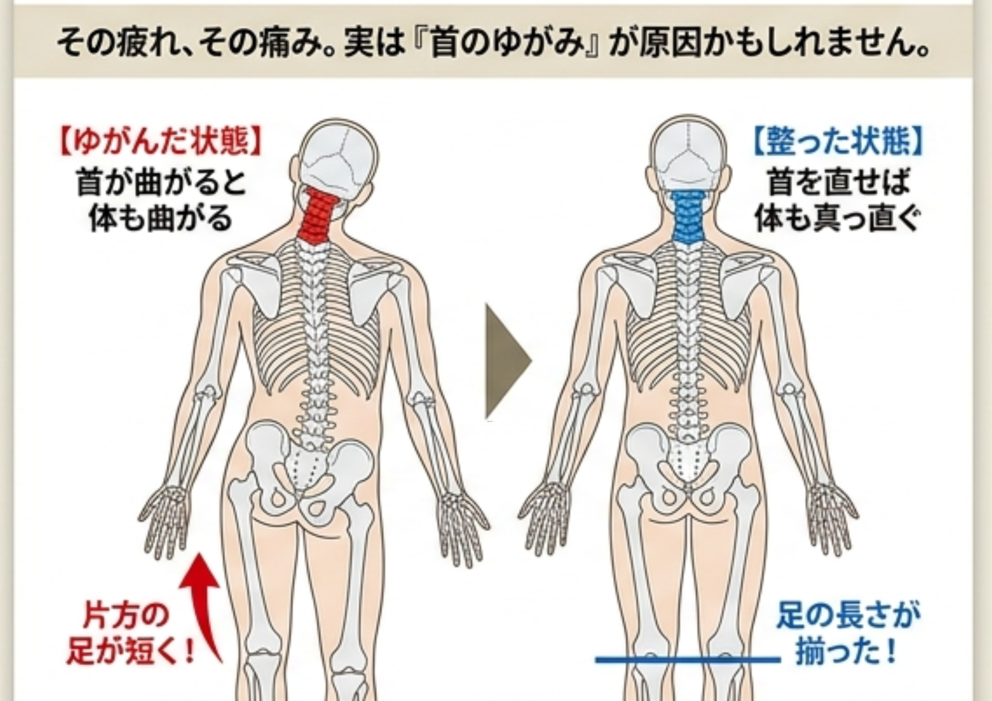 ・首の歪み・骨盤の歪み ・脊骨の歪み ・自律神経の不調 ・血管の循環不良 ・筋膜の捻れ・歪み などが挙げらます。