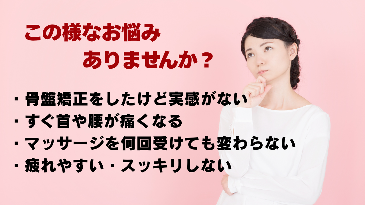 痛いところを揉む、電気を当てる、薬を飲むも治らない、ぶり返す。そのような場合は根本改善するために、首から全身を正すことをご提案します。