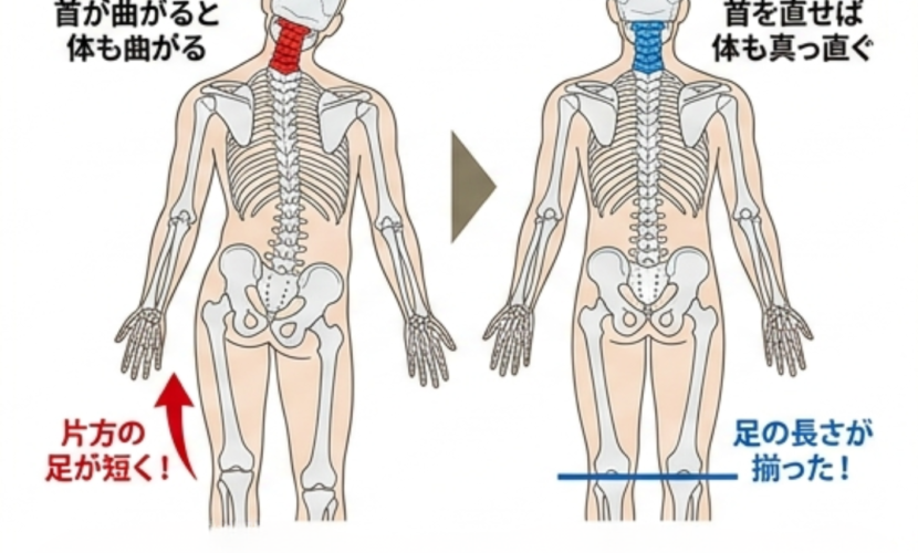 ​ 首が傾くと、その代償として腰の筋肉が常に「無理な踏ん張り」を強いられます。