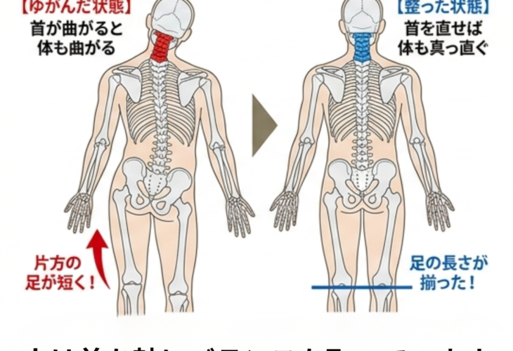 首(頚椎)と腰(腰椎)は、背骨(脊椎)という1本の骨でつながっています。そのため、離れた部位であっても、どちらかの歪みや負担は全体に連動します。…